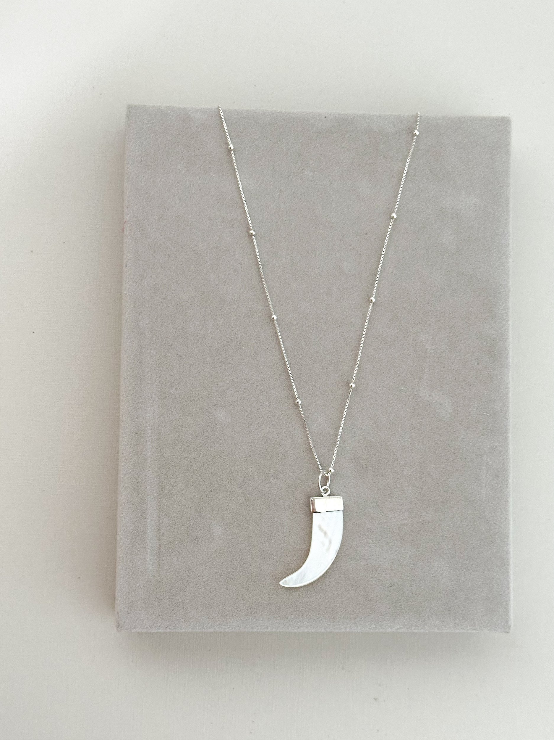 para quem não é nada básica, colar de bolinhas com 60 cm e um pingente de dente de sabre em madrepérola natural.